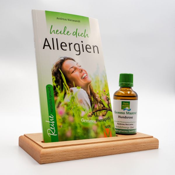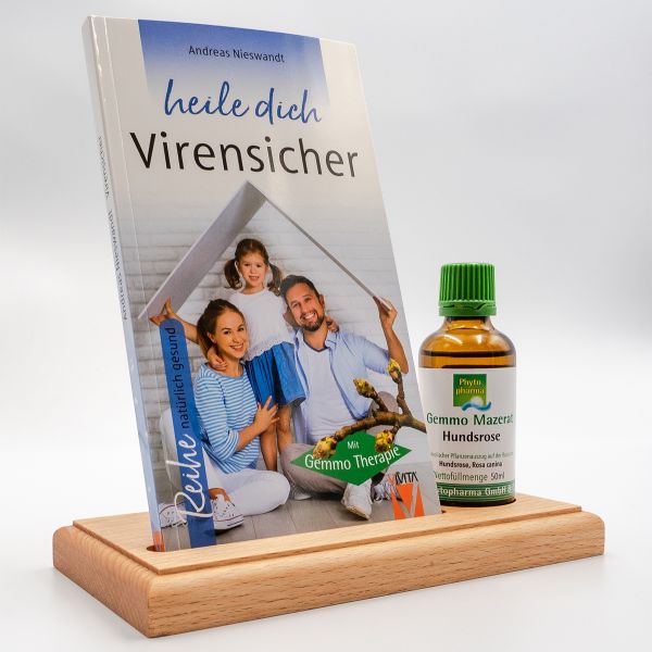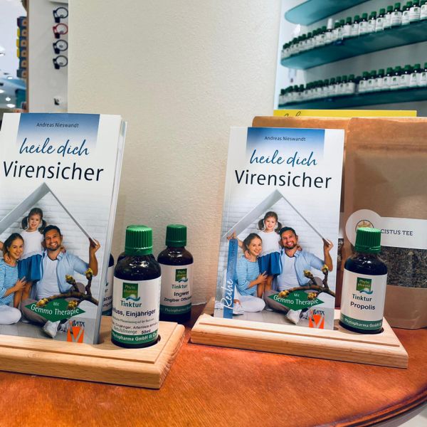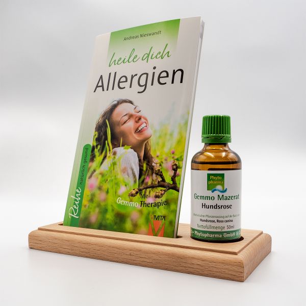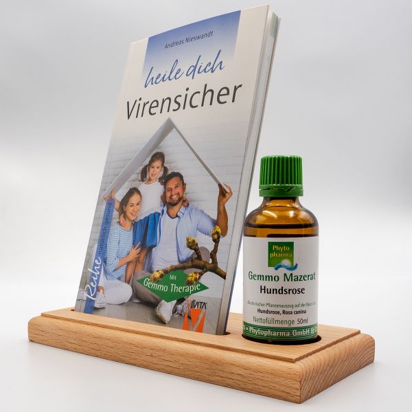 Der Buchaufsteller dienen der Präsentation eines Buches in Verbindung mit einer Tinkur bis zu einem Volumen von 50 ml bzw. einem Flaschendurchmesser von 40 mm. Der Buchaufsteller wird aus Echtholz, Buche natur, in Deutschland liebevoll exklusiv für den VIVITA-Verlag handgefertigt.
